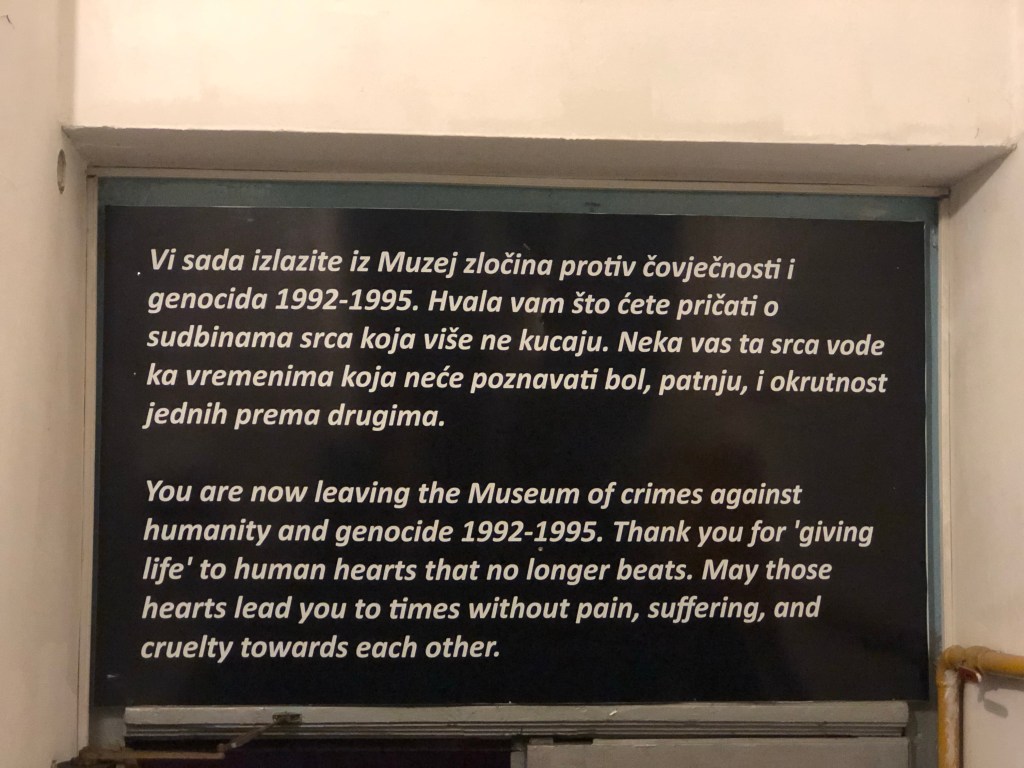Es el primer museo en exhibir los crímenes contra la humanidad y genocidio cometidos en Bosnia. También muestra la caída de Yugoslavia. La entrada cuesta aproximadamente 5 euros y se puede pagar en la entrada.